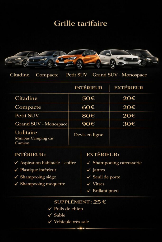 Le lavage automobile extérieur comprend le nettoyage de la carrosserie, des jantes, des roues, des vitres, des rétroviseurs, des pare-chocs, du toit et des bas de caisse. En complément, le polissage voiture permet d’atténuer les micro-rayures et de raviver la peinture, tandis que le lustrage automobile apporte une finition brillante et un rendu visuel soigné.