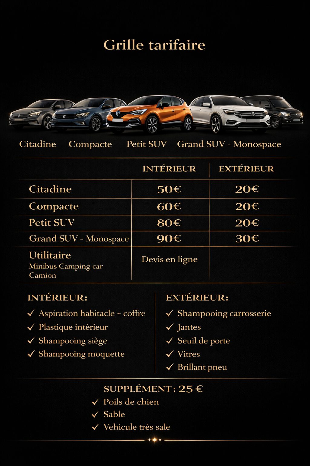 Entretien soigné de citadines, berlines et SUV, avec attention portée aux finitions et au confort de conduite.